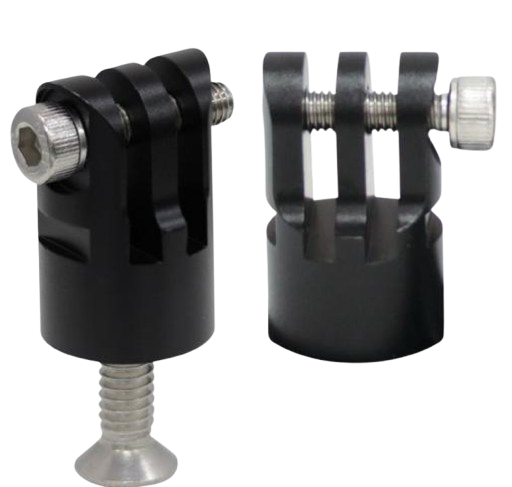 Adapter met een GoPro-achtige bevestiging aan de bovenkant die je op een standaard tray kunt bevestigen.