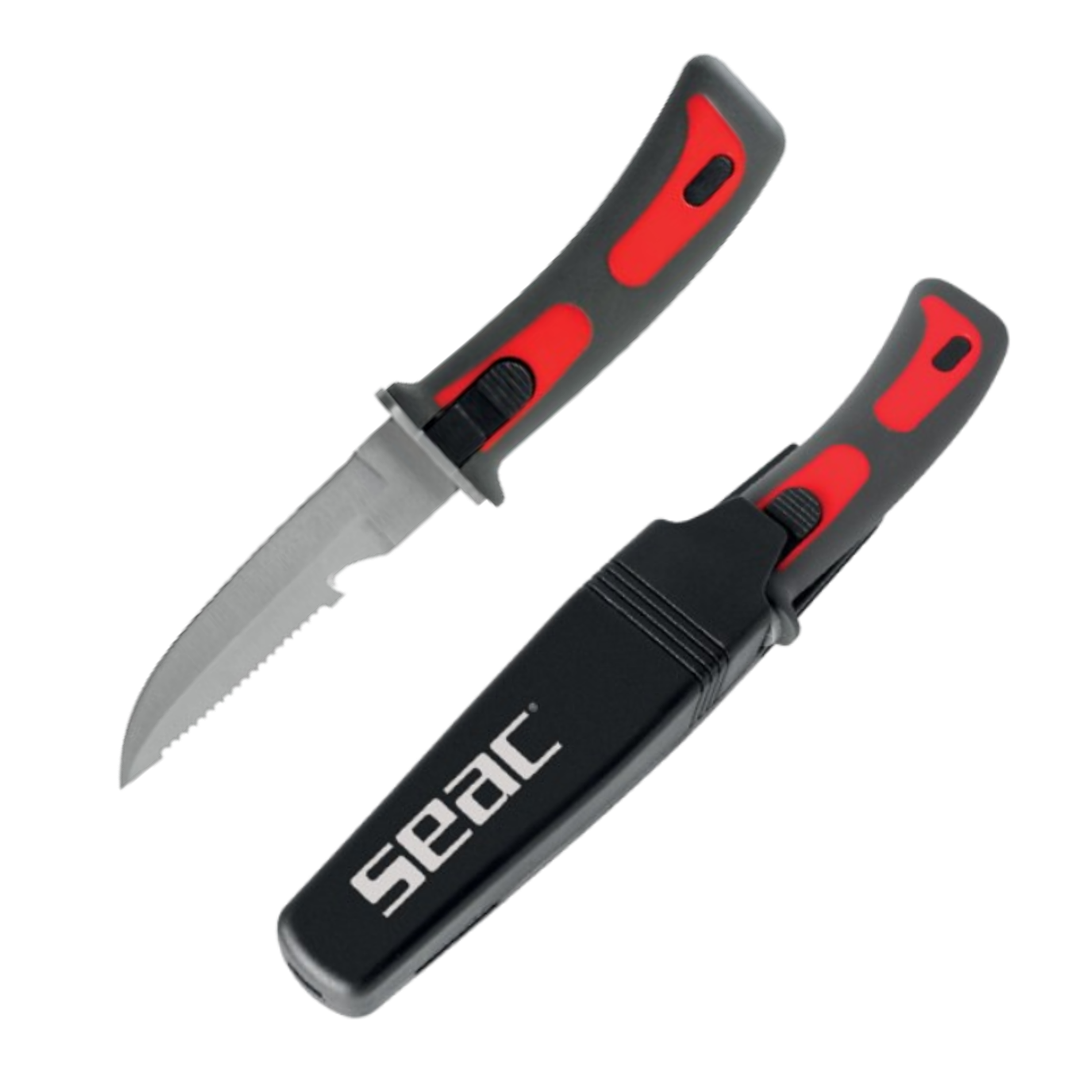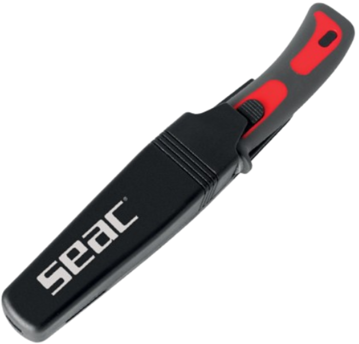 Het handvat is voorzien van een overmolding die de grip verhoogt. De Seac Bat-schede is stijf en kan dankzij de meegeleverde praktische riemen aan de arm of onderarm worden bevestigd. De ontgrendelknop is in het handvat geïntegreerd.