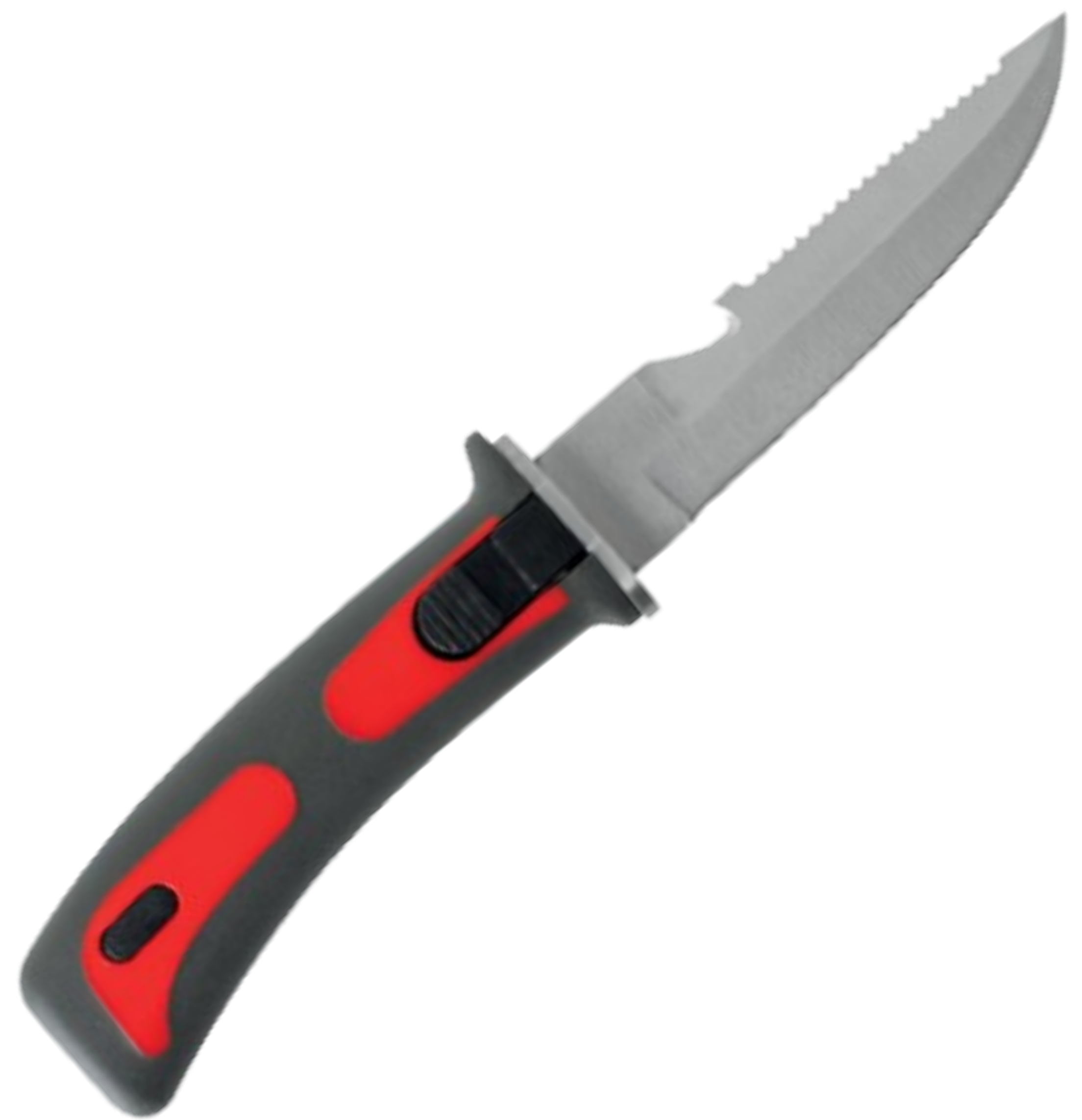 Aan de basis van het handvat bevindt zich een kleine stalen hamer, erg handig om geluid te maken door ermee op de tank te slaan en de aandacht van andere duikers te trekken.