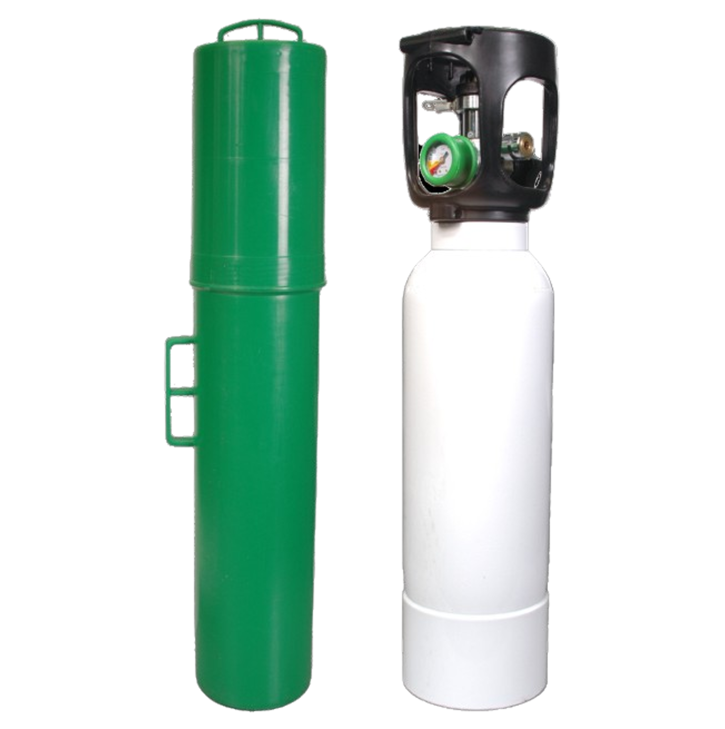 5 Liter stalen Noodzuurstofset in groene kunststof koker voor makkelijk vervoer en snelle inzet.