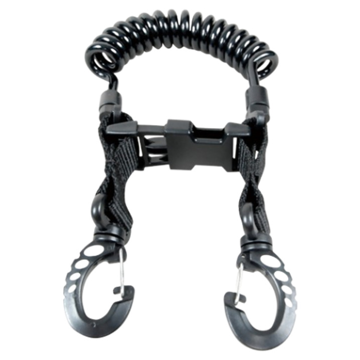 Spiraalkabel van ca 1 meter met aan de uiteinden 2 snap-clips om eenvoudig Uw Camera, Console e.d. veilig aan Uw BCD te bevestigen.